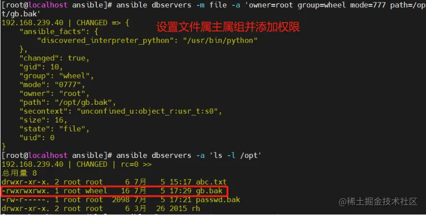 ansible dbservers -m file -a 'owner=root group=wheel mode=777 path=/opt/gb.bak'