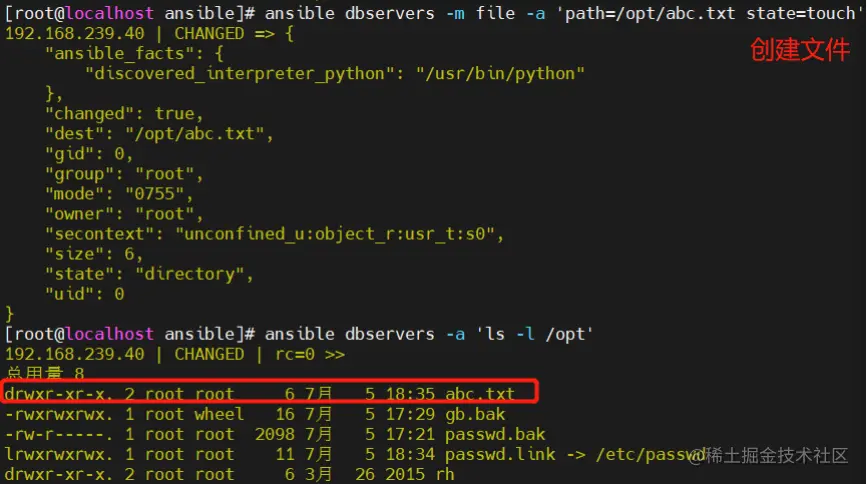 ansible dbservers -m file -a 'path=/opt/abc.txt state=touch' #创建一个文件