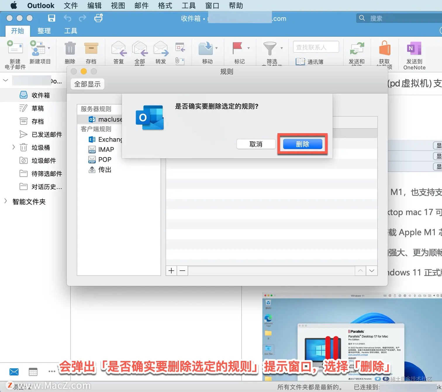 在「规则」对话框中选择电子邮件账号,选择要删除的规则,按 Delete 键。