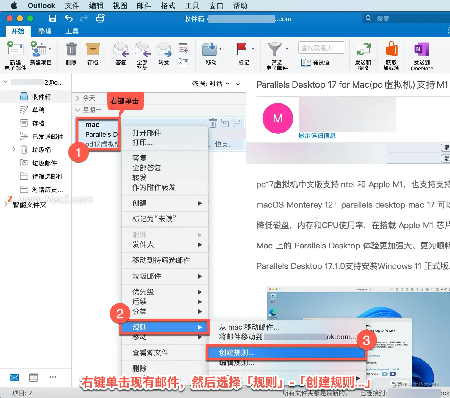 根据邮件创建规则,右键单击现有邮件,然后选择「规则」-「创建规则...」。