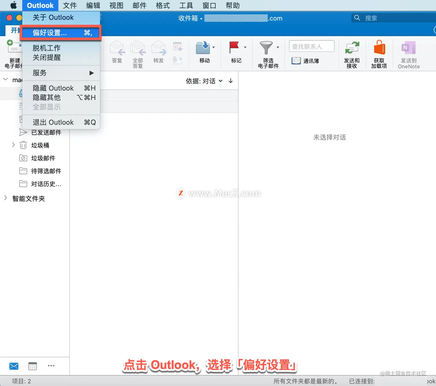不再需要某个规则时可将其删除,点击 Outlook,选择「偏好设置」。