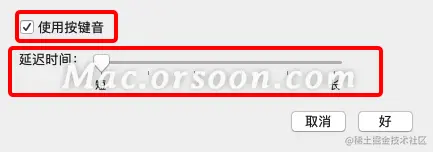 5、在弹出的弹窗中,勾选“使用按键音”,然后调整下边的“延迟时间”到最左边;