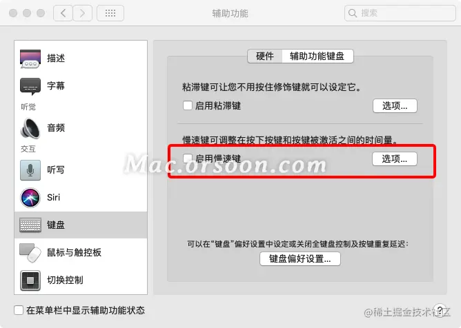 4、在窗口的右边勾选“启用慢速键”,单击后边的“选项”按钮,