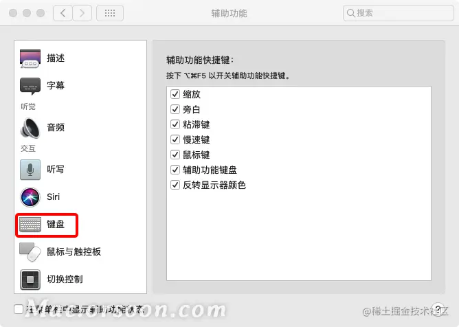 3、进入辅助功能的窗口,在窗口左边的列表里单击“键盘”;