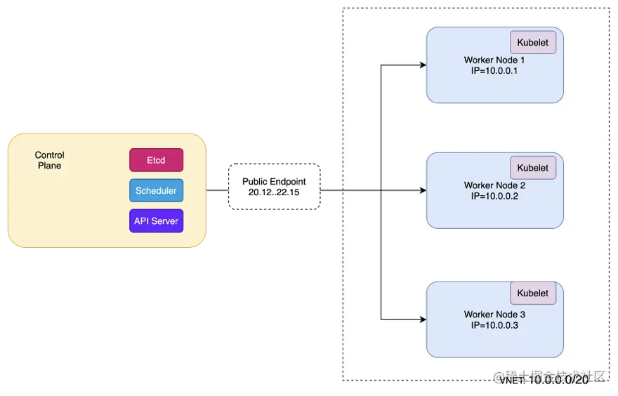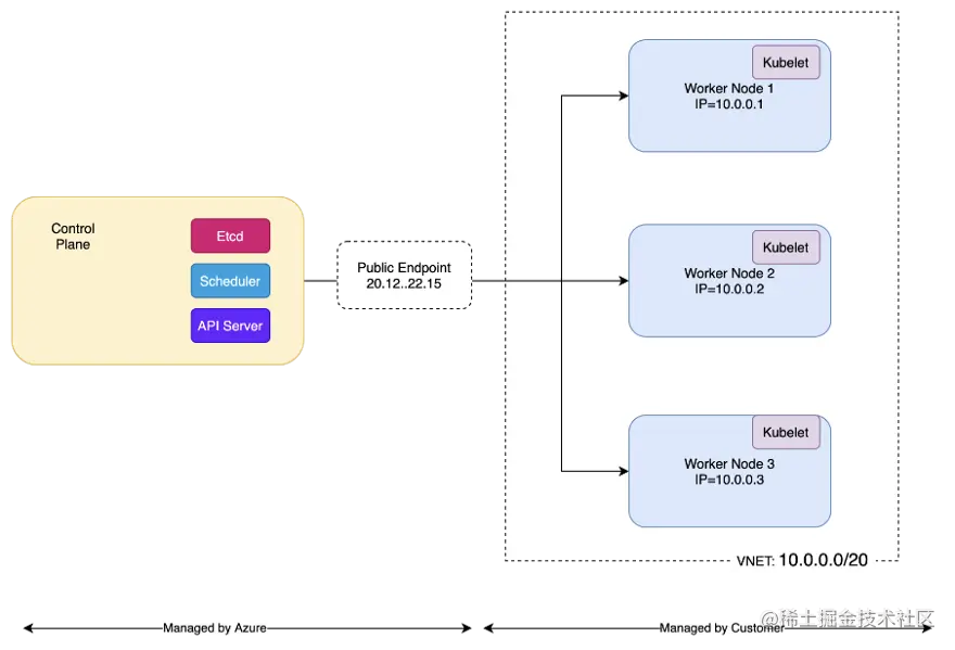 尽管工作节点在VNET内部,并且只有私人IP地址,但它们确实可以访问公共互联网。通过这种方式,他们可以通过公共IP地址到达控制平面。