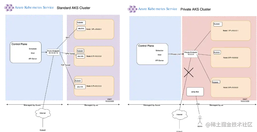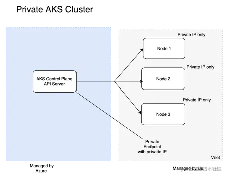 标准Azure Kubernetes服务集群的API服务器有一个公共IP地址,私有AKS集群的API服务器端点有一个私有IP地址。在标准AKS集群和私有AKS集群中,工作节点都有一个私有IP地址。