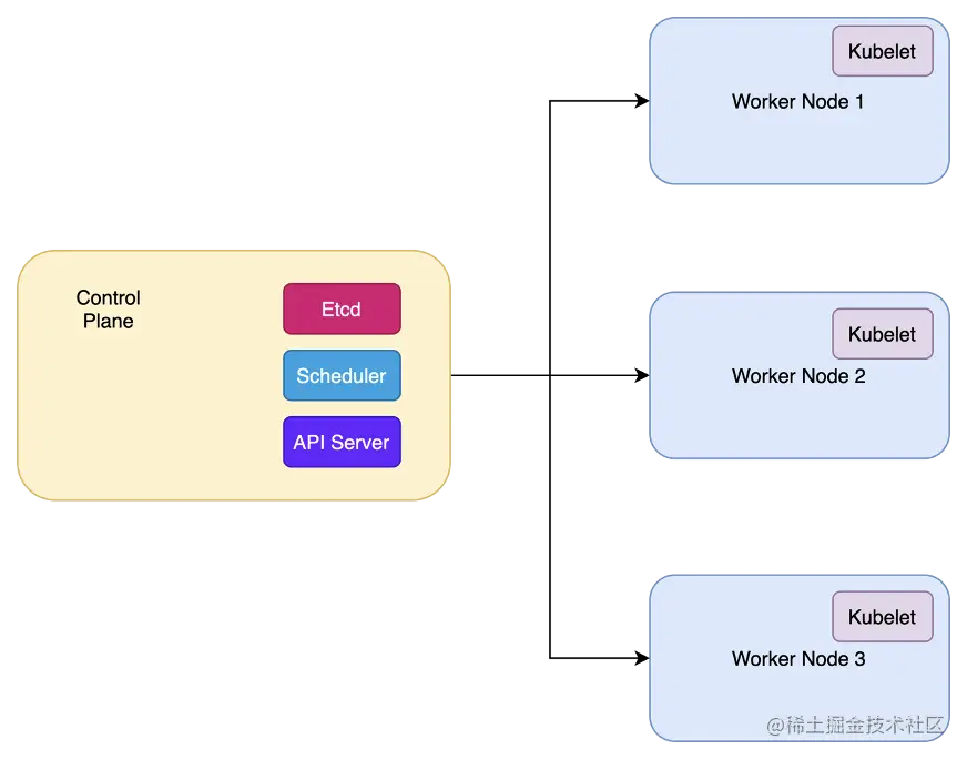 我们有一个调度器,用于调度不同节点上的工作负载。还有API服务器,用于管理Kubernetes,然后我们还有Etcd。