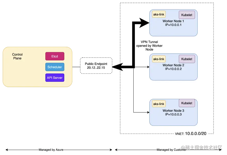 但不管是哪种实现方式,想法都是一样的。在由Azure管理的控制平面与运行在私有VNET中的工作节点之间建立连接。