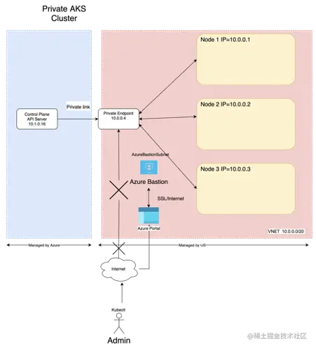 为了从外部访问控制平面,你需要使用VPN,或者如果不可能的话,你可以通过一个跳线盒访问API服务器,或者最近你可以使用Azure Bastion。
