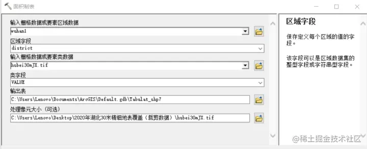 面积制表窗口第一行为武汉市各区行政区划,区域字段选县级市,输入栅格数据为上面裁剪好的武汉市土地利用图,类字段选择vaule,输出位置自由选择,处理像元大小默认。