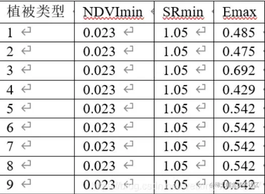 引用朱文泉教授研究结果,配置 9 类植被类型的 NDVImax、NDVImin、SRmax、SRmin 和 Emax(理想状态下最大光能利用率)参数。 其中 NDVImax 和 SRmax 的计算需要东北地区植被类型图和 NDVI 时间序列最大值数据。