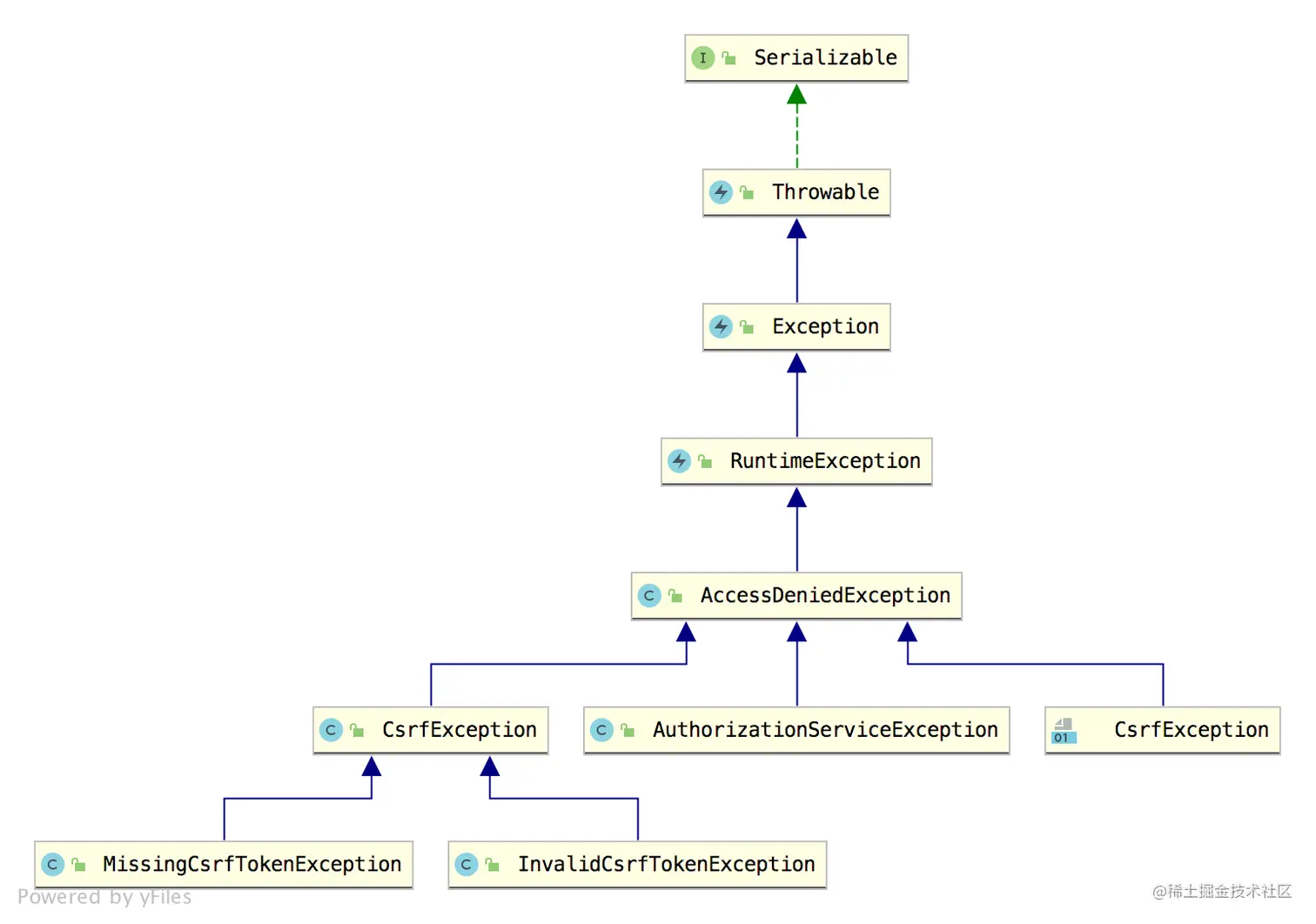 另一类就是授权异常 AccessDeniedException,授权异常的实现类比较少,因为授权失败的可能原因比较少。