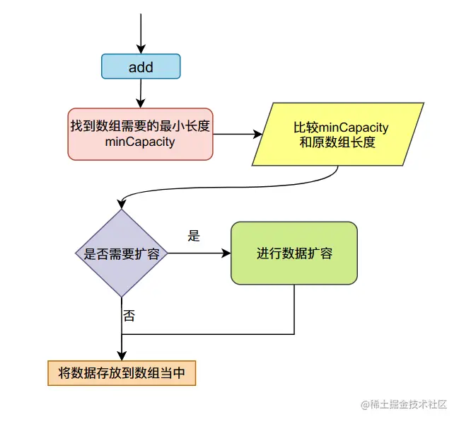 add方法之后,我们需要找到符合要求的最小数组长度,这个值通常是容器当中元素的个数size + 1,也就是图中的minCapacity首先先比较这个值和现在数组的长度,如果长度不够的话则需要进行扩容,将数组的长度扩大到原来的两倍。 - 如果不需要扩容,则直接讲元素放入到数组当中即可。