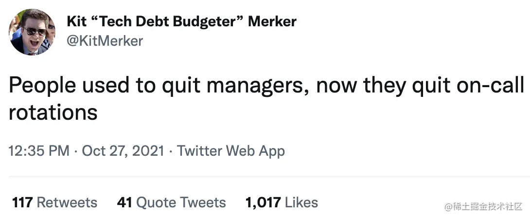 正如Nobl9首席运营官Kit Merker最近在推特上所说的那样,"人们曾经放弃了经理,现在他们放弃了轮流值班。"