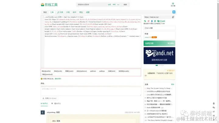 简介:美化:格式化代码,使之容易阅读。净化:将代码单行化,并去除注释。整理:按照一定的顺序,重新排列css的属性。优化:将css的长属性值优化为简写的形式。压缩:将代码最小化,加快加载速度!
