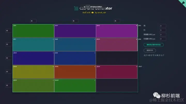 简介:您可以设置行和列的数字还有单位,我将为您生成一个 CSS Grid 网格布局!在方框中拖动来创建 div 放置在网格内。