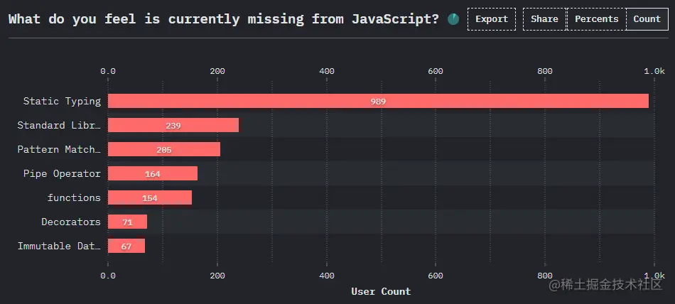根据20年、21年state of JS的统计,静态类型高票当选JS中当前最欠缺的功能。