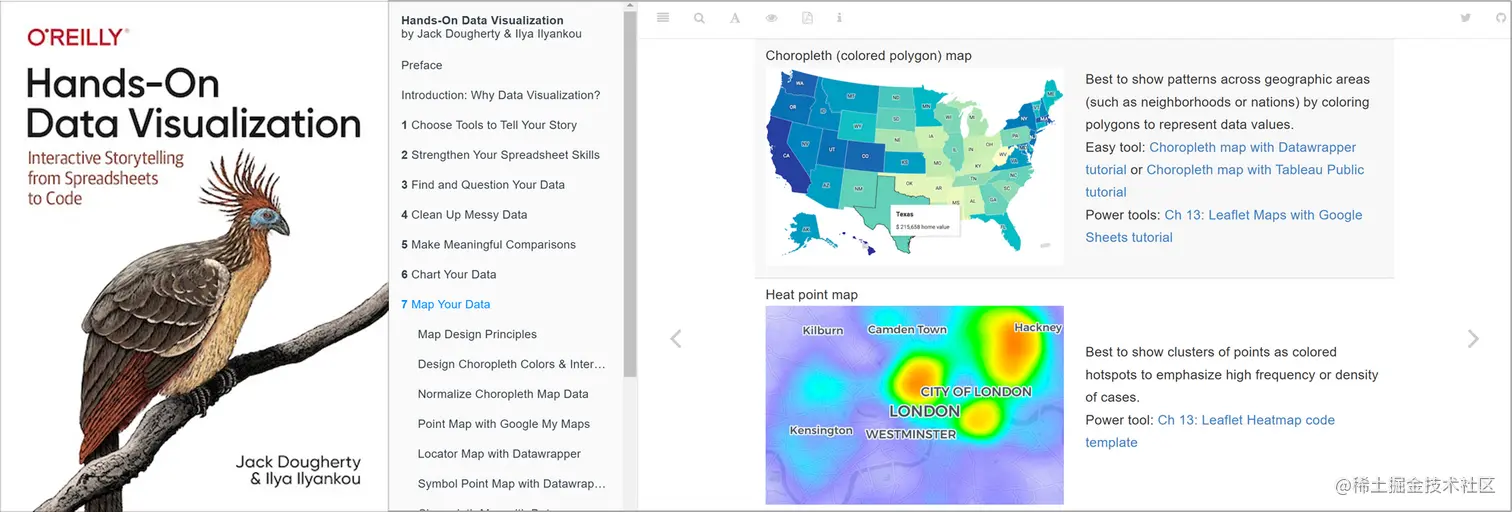 《Hands-On Data Visualization:Interactive Storytelling from Spreadsheets to Code》,作者 Jack Dougherty、Ilya Ilyankou。本书通过教程、实例和线上免费且易学的工具资源,一步步地引导如何将数据从电子表格中取出,并转化为生动的互动故事。不需要编码经验。