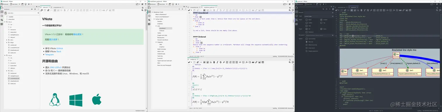 VNote 通过强大的笔记管理功能,使得 Markdown 的阅读、编辑、预览、图片管理、UML图表、流程图、数学公式等体验更加轻松舒适。VNote支持主流操作系统 Linux、Windows、macOS,并将支持更多的文档格式。