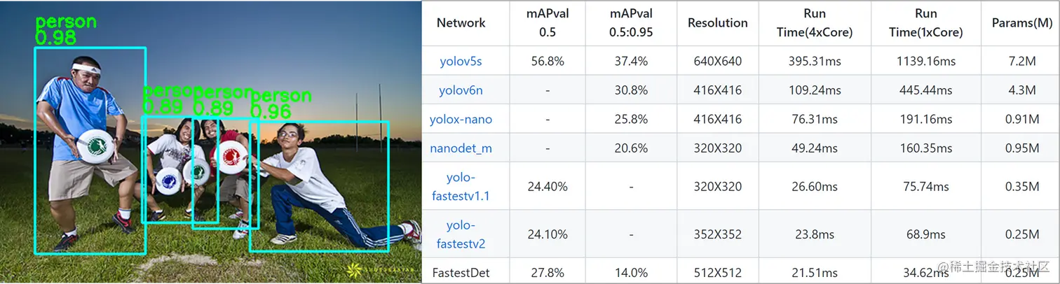 FastestDet 是针对计算资源紧缺的ARM平台设计的,突出单核效能,用来接替 yolo-fastest 系列算法。相比于业界已有的轻量级目标检测算法(如yolov5n、yolox-nano、nanoDet、pp-yolo-tiny、FastestDet),FastestDet 无论在速度还是参数量上,都是要小好几个数量级的——参数仅为250K,与最快速算法相比时间消耗减少30% ,当然精度自然也比不过。