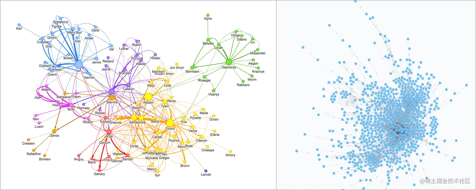 Quickstart Example 展示了详细流程与代码。从一个空白的Neo4j实例开始,加载《权力的游戏》数据集,生成通过INTERACTS连接的角色节点图。随后拉入neovis.js,通过vis.js可视化库果,实现节点大小与角色的页游评分成正比、节点的颜色由社区属性决定、关系的粗细与INTERACTS关系上的权重属性成正比等可视化效果。