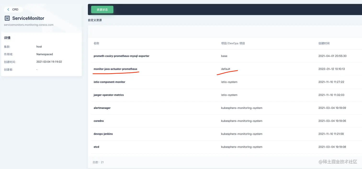 执行成功后我们可以在集群的 CRD 下面搜索 ServiceMonitor 并打开可以找到我们部署的 ServiceMonitor 配置。如图所示: