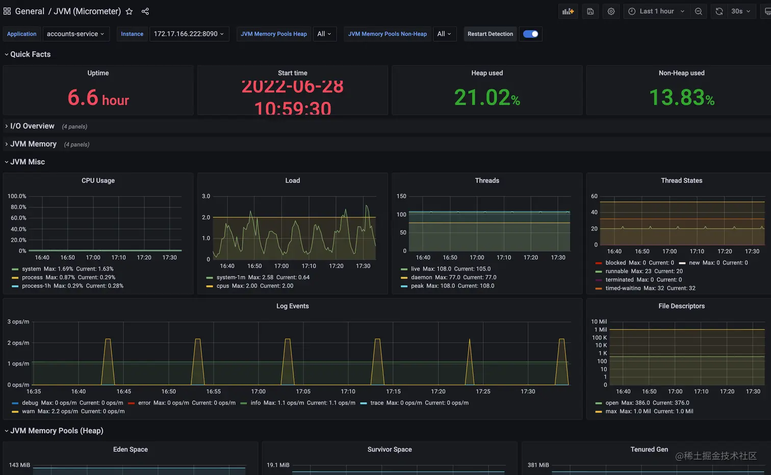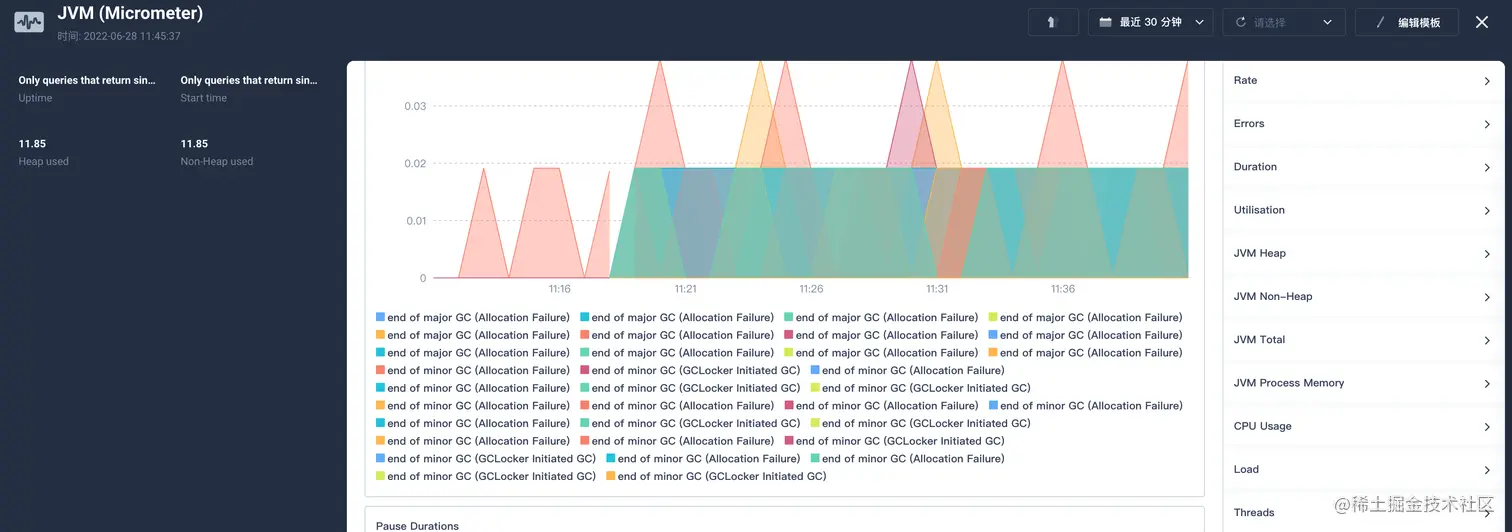 在下一步后系统会让我们上传 JSON 模版 我们可以通过 grafana 官网下载一些通用的模版配置,这里我们使用的是 JVM (Micrometer)。在右侧可以下载 JSON 文件。