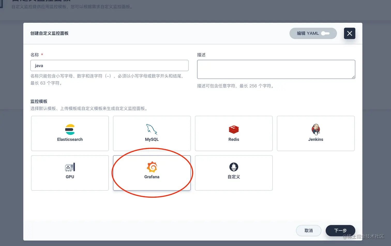 我们点击创建 可以看到 KubeSphere 已经集成了部分监控面板,这里我们选择 Grafana。