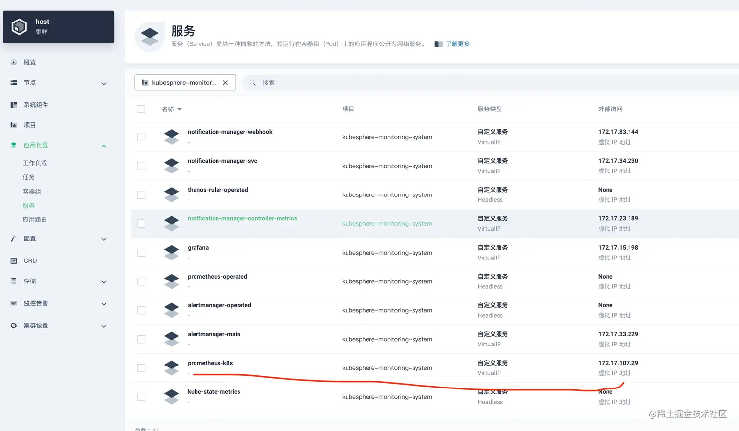 我们可以在集群中的如下地址找到 KubeSphere 系统集成的 Prometheus 服务,如图所示