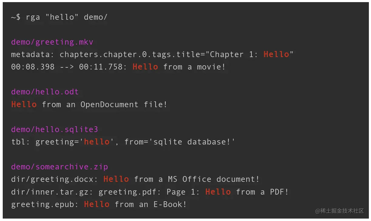 rga 是一个类似于 grep 的文本内容搜索工具,但支持更多的文件类型,比如 pdf、docx、sqlite、jpg、视频字幕(mkv、mp4)等。