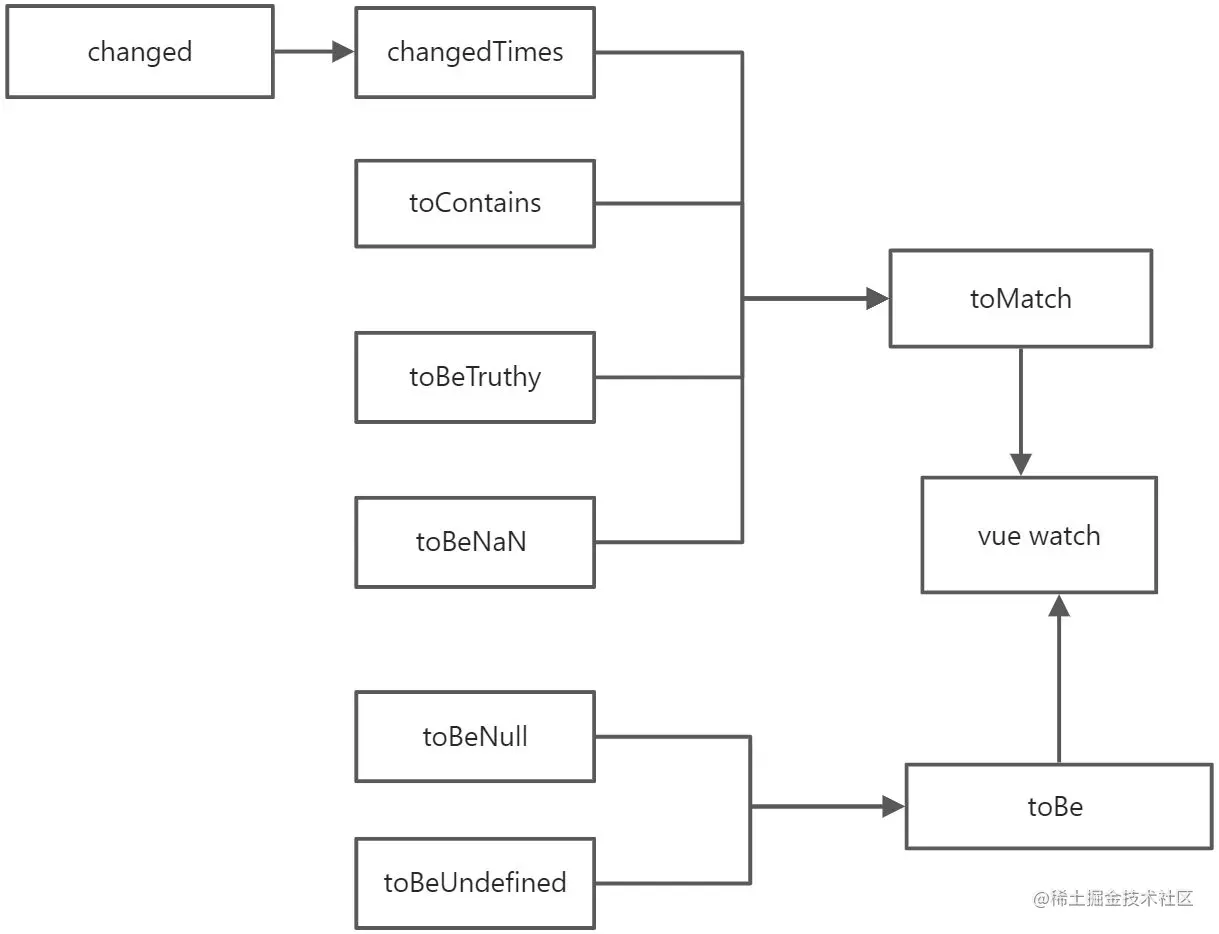 toBe方法体大部分和toMatch相同,只是watch回调函数不同。这里对数据源r和toBe的参数value进行监听,当r的值和value的值相同时,使promise状态为成功。注意这里的watch使用的是侦听多个源的情况。
