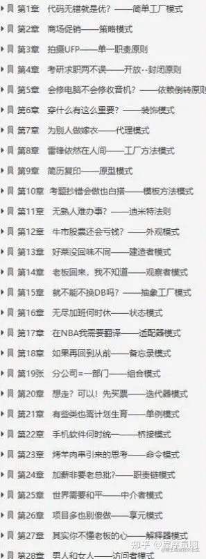 - 第三部分是对设计模式的总结,利用小菜梦想到的超级模式大赛的场景,把所有的面向对象和模式概念都拟人化来趣味总结设计模式之间的异同和关键点;