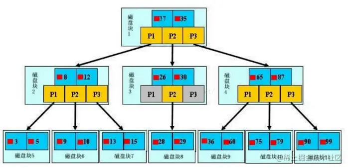 最外层浅蓝色磁盘块1里有数据17、35(深蓝色)和指针P1、P2、P3(黄色)。P1指针表示小于17的磁盘块,P2是在17-35之间,P3指向大于35的磁盘块。真实数据存在于叶子节点也就是最底下的一层3、5、9、10、13......非叶子节点不存储真实的数据,只存储指引搜索方向的数据项,如17、35。