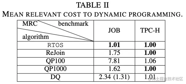 第一个指标:论文以 DP 作为基线,并按照之前的工作报告其他方法的 MRC(mean relative cost, 平均相对成本 ),其中 MRC = 1 表示与 DP 性能相同。观察 Cost 和 Latency 的结果可以发现,RTOS 在 Cost 上要优于其他四种方法,且几乎与 DP 相等,在 Latency 更佳,是所有方法中延迟最低的。