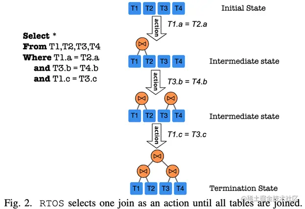 在 RTOS 中 Agent 对应优化器,通过与 Environment(对应 DBMS) 的试错交互从反馈中学习。对于图中所示的一条 SQL 查询语句,随着强化学习过程的推进会进入不同的 State(每个 State 对应着连接计划)。RTOS 读取当前计划并利用 Tree-LSTM 来计算估计的长期 Reward(例如,哪个表应该连接起来以使当前状态更完整)。然后它会选择具有最大 Reward(对应最小 Cost) 的预期最佳 Action。当所有的表都被连接 (即,导出一个完整的连接计划) 时,连接计划将被发送到 DBMS 执行。