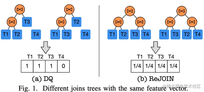 假设一个数据库有 4 个表 T1、T2、T3、T4。DQ 使用独热编码 (1 表示表在树中,否则为 0) 来编码连接树:图中可以发现 ((T1,T2), T3) 和 ((T1,T3),T2) 具有相同的特征向量 [1,1,1,0]。ReJOIN 使用连接表的深度构造特征向量:图 (b) 中可以发现,每个表的深度是 d = 2,((T1,T2),(T3 T4)) 和 ((T1, T3), (T2,T4)) 具有相同的特征向量 [1/4,1/4,1/4,1/4]。