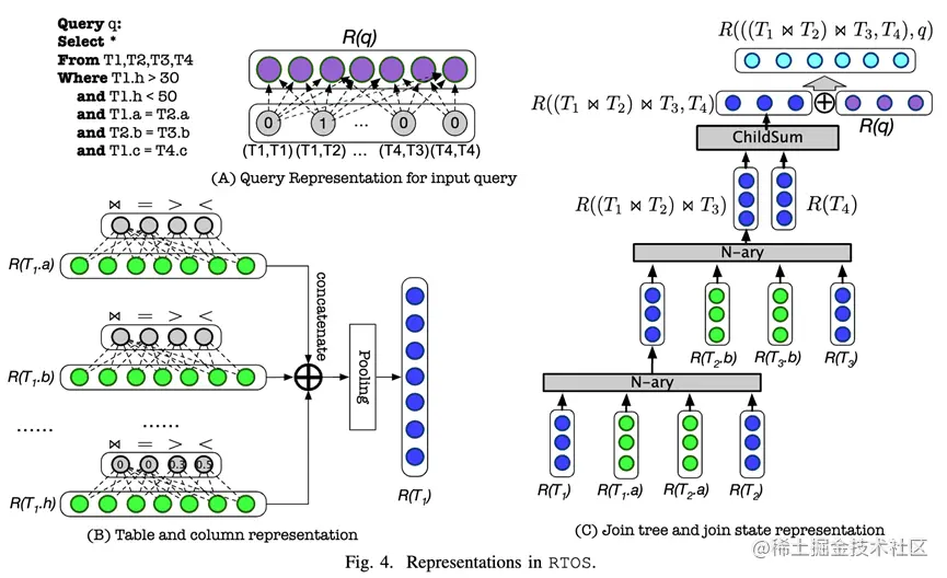 前两种信息包含了之前方法:DQ,ReJOIN 中提到的特征向量信息,最后一种表示保留了连接顺序以及完整的连接树的结构信息。通过神经网络来表示的状态信息可以实现在需要修改数据库模式,例如新增加一列或者一个表时,可以通过申请新的参数来实现,而不需要重新训练模型。