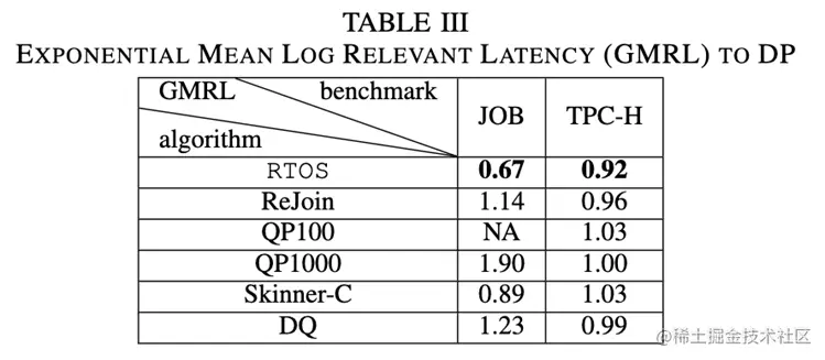 第二个指标:论文把数据集中的查询按照模板进行分类,计算 GMRL( Geometric Mean Relevant Latency, 几何平均相关延迟),从图 9 中可以发现,大多数情况下 RTOS 的性能都不弱于 DP,且优于其他方法。对于 T20,T26,T28,T29 等 RTOS 的性能要远远好于 DP,是因为实验数据中的测试模板多数是比较长或者是带有多别名的查询,传统的开销模型往往会出现估算不准确的问题,导致基于 Cost 选择出的计划可能不是最优,而 RTOS 可以解决这一问题,通过从查询执行的 latency 中进行学习,可以修正选择出的计划,实现更高性能。