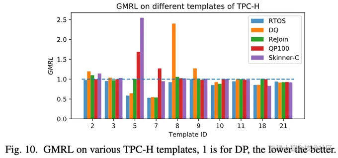 图 10 显示了 TPC-H 不同模板上的,图中没有展示 DRL 方法与 DP 方法执行相同的模板,以获得更好的视图。可以发现对于所有模板,RTOS 生成的规划并不比 DP 差 (在 GMRL= 1 处的水平线),也比其他方法好。