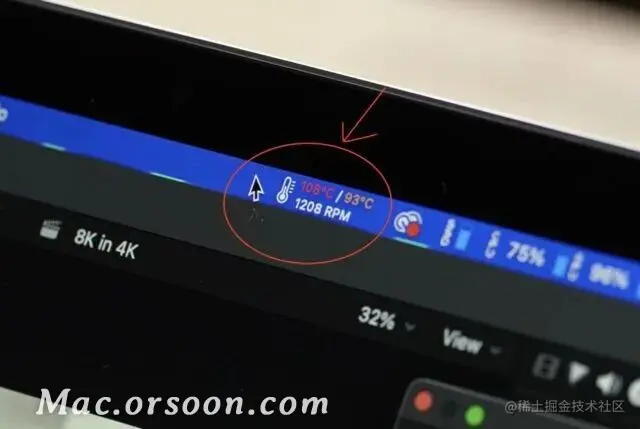 108℃的高温是在导出 8K 佳能 RAW 视频时达到的,该测试对 CPU 和 GPU 的压力都达到了极限。M2 MacBook Pro 达到这个温度时,风扇正以 7200rpm 的峰值转动。这意味着,由于风扇已经尽其所能地控制温度,系统只有一个办法来降低温度:过热降频。这会降低设备性能,但可以防止芯片因过热而损坏。