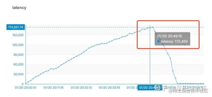 1.20晚上8点业务线开始切换LBS相关流量,在之后的1个小时时间内,积压量呈上升趋势,一路到达50W左右,第二天的图没贴出具体是50W数字,以下是第一天晚上的贴图部分。