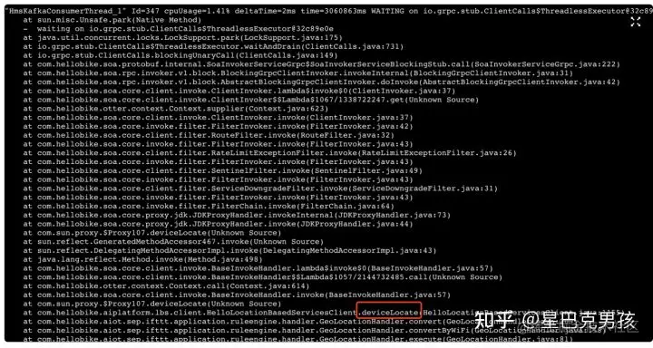通过命令:thread-n3-i 500(阿里开源诊断工具Arthas:thread命令) : 列出500毫秒内最忙的3个线程栈,其中就有两个属于调用地理位置服务的线程。
