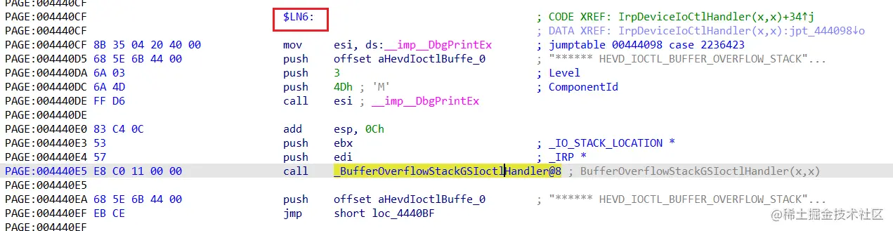 PAGE:004452C8 loc_4452C8: ; CODE XREF: BufferOverflowStackGSIoctlHandler(x,x)+13↑j
