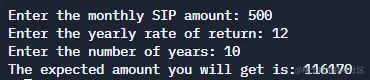 amount = float(input("Enter the monthly SIP amount: "))