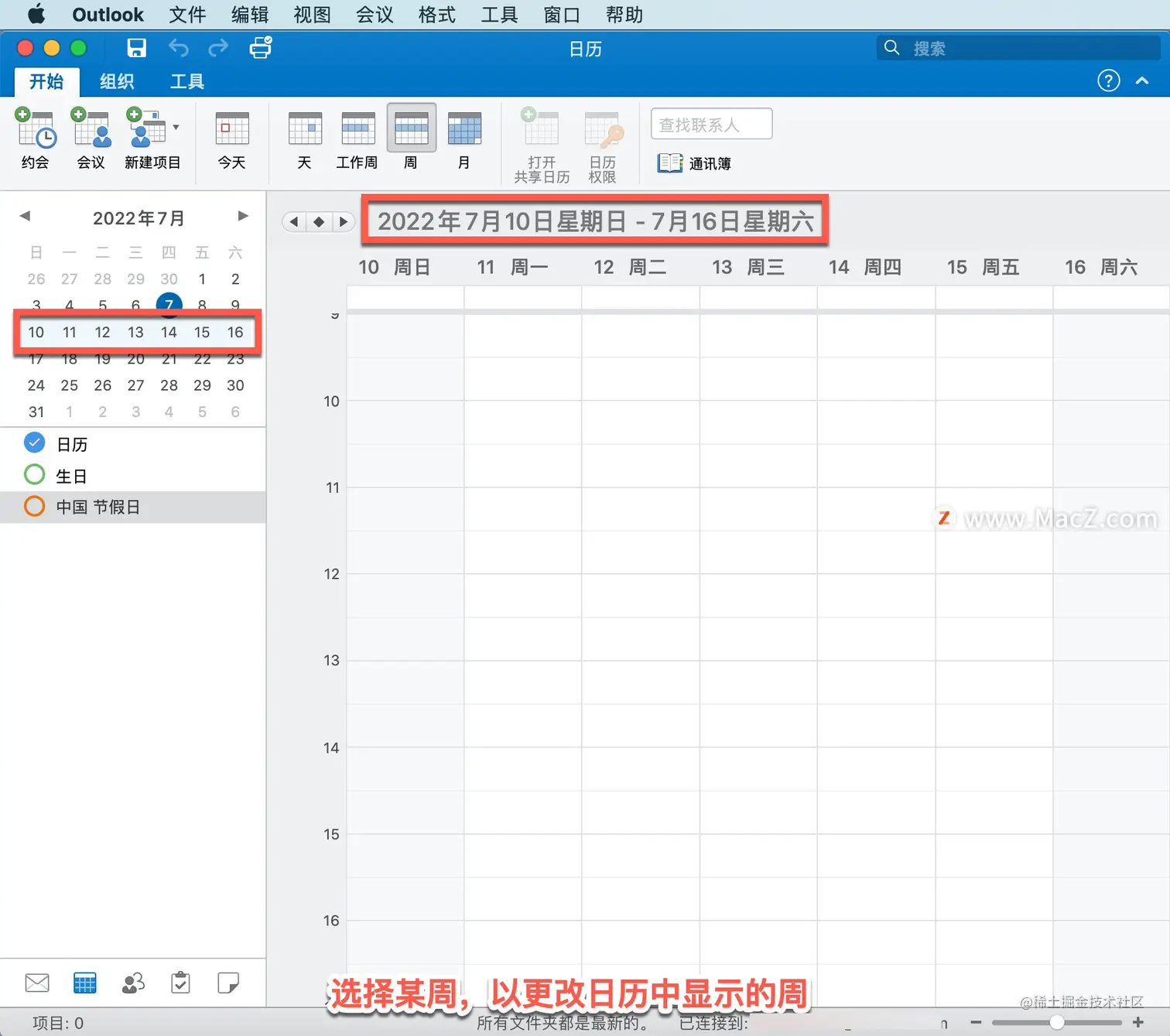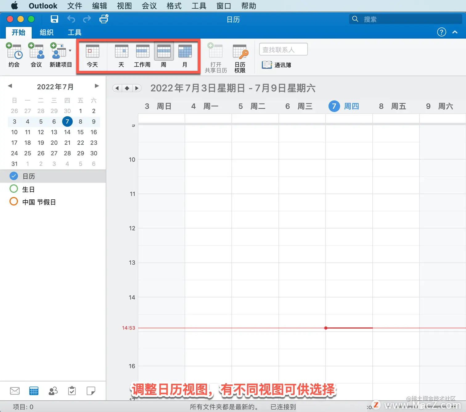 在 Outlook 日历视图中可以切换日、周或月视图,更改显示的周,并查看不同的共享日历。