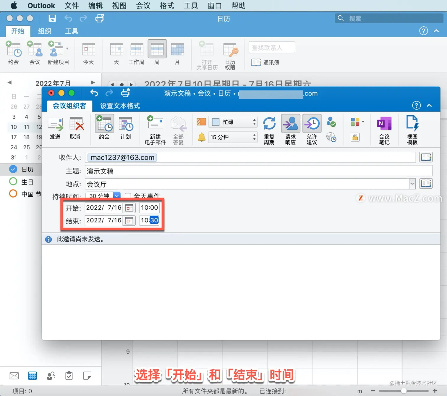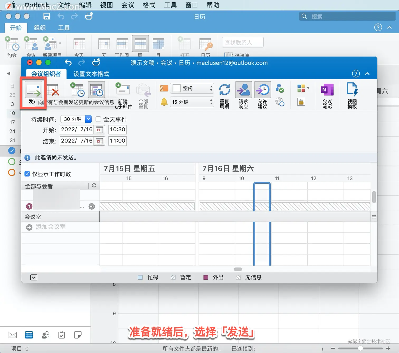 在「收件人」字段中添加人员,然后输入「主题」和「位置」。