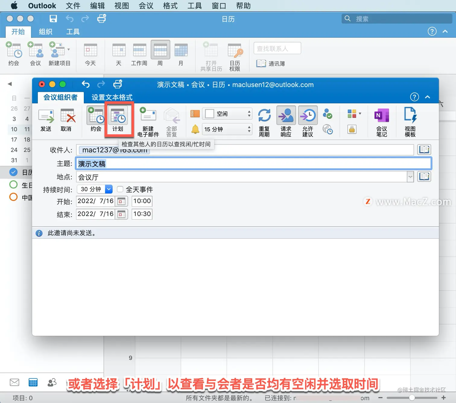 或者选择「计划」以查看与会者是否均有空闲并选取时间。