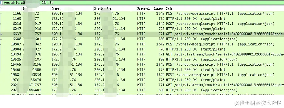 通过调用API接口查看,发现4G设备一直有人拉流,导致设备一直存在流量消耗的情况。于是和用户反复确认是否有人在观看视频和拉流,用户答复无人登录平台。为了进一步排查是什么原因导致设备一直有人拉流,我们便进行了服务抓包查看。