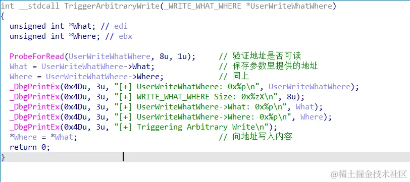 代码功能是参数提供一个结构,结构里包含一个写入地址,一个写入内容地址,向写入地址里写入指定的内容(4字节),只要能覆盖一个要执行的函数的地址,然后执行这个函数的时候就会调用到内核态的shellcode上去,由此这是个任意地址写入漏洞