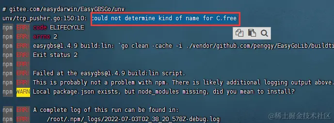在EasyGBS平台功能的开发与测试过程中,我们在go中加上C.free释放内存,出现下图报错:“could not determine kind of name for C.free”(编译失败)。